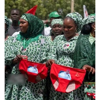 Photos and videos circulating on social media show women at a recent gathering, believed to be linked to an APC rally or early 2027 campaign activities, waving and displaying the branded panties.