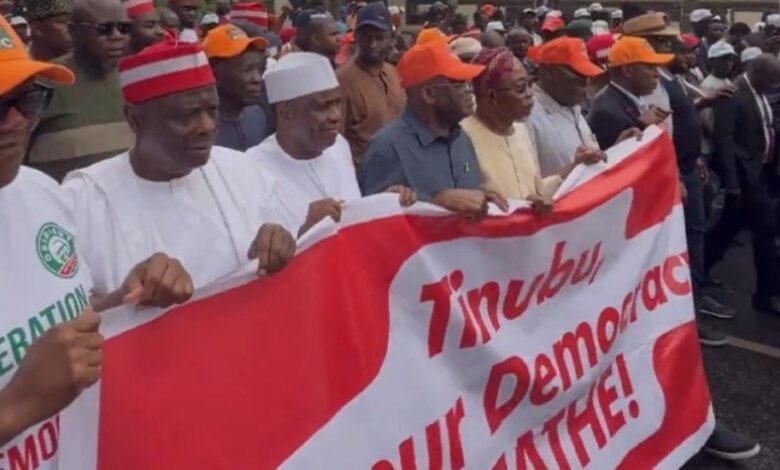 Peter Obi, Atiku, David Mark, and Amaechi lead ADC Protests against INEC in Abuja